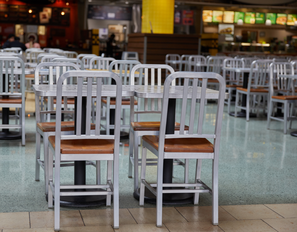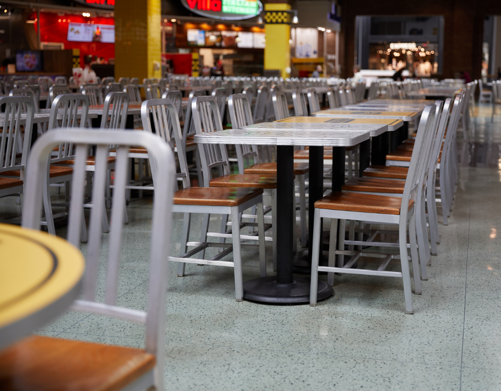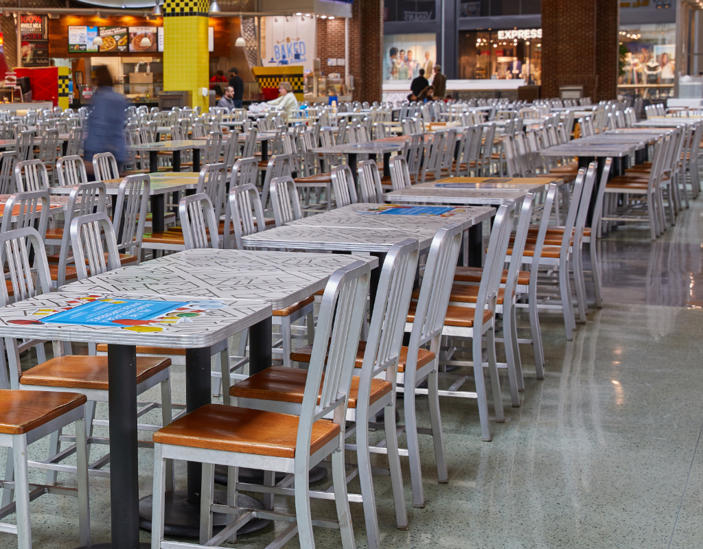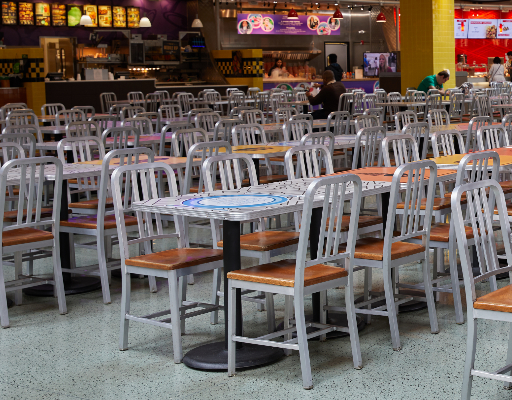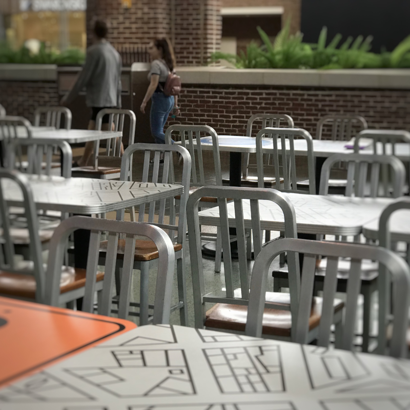 A mix of custom graphic laminates, unique to this environment, truly set this project apart. The design team conceived and created an abstract street map inspired by the bustling modern shopping complex, as well as clever food icons.