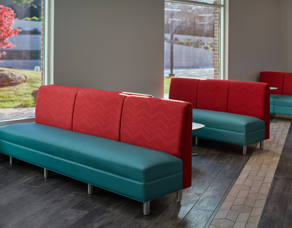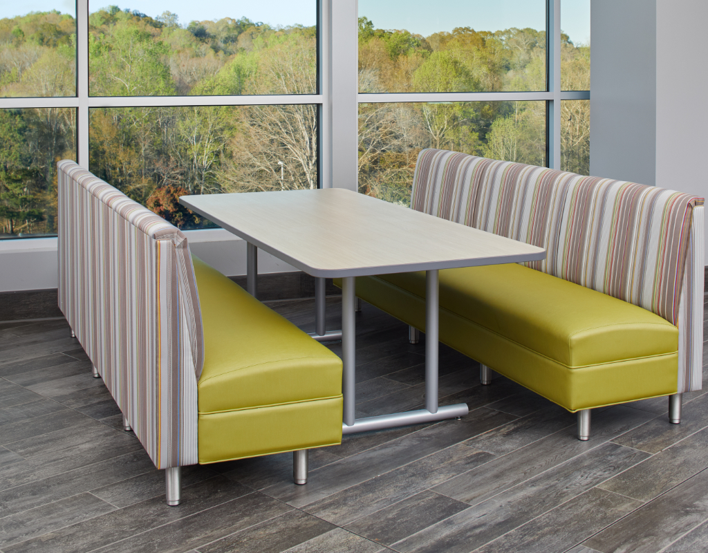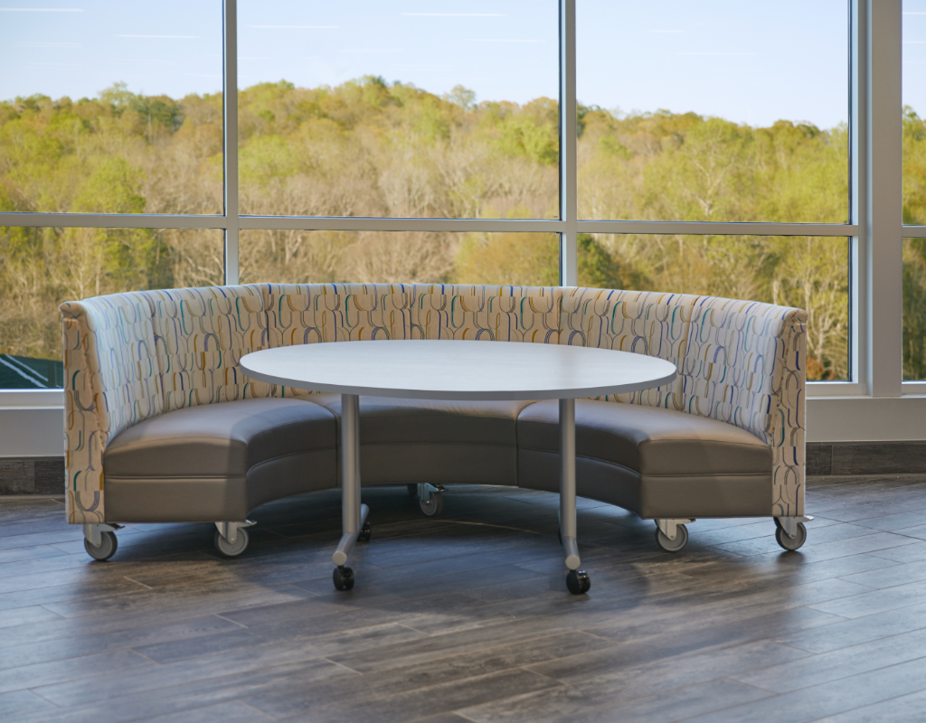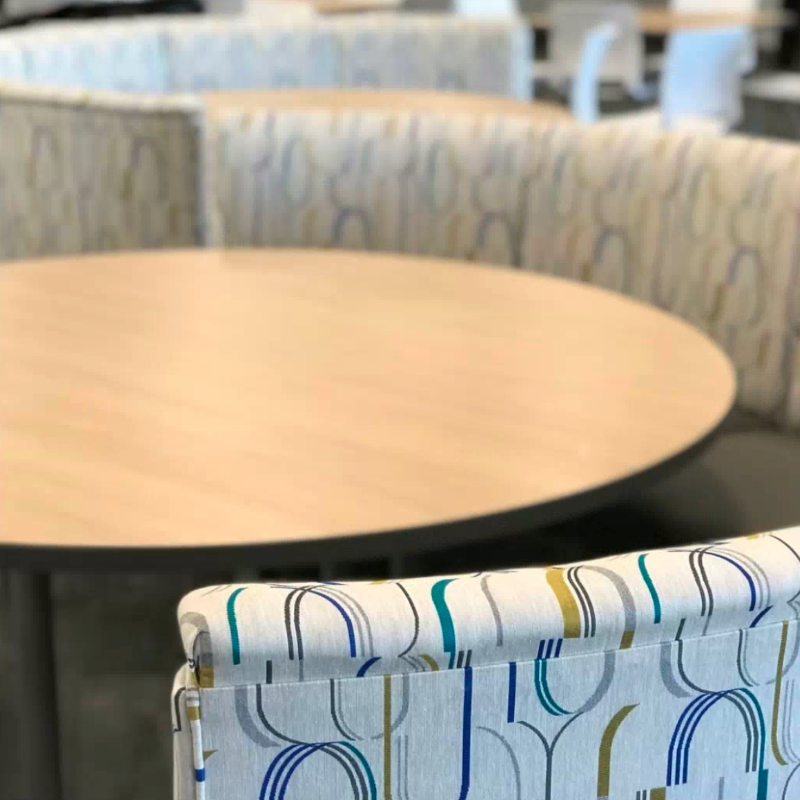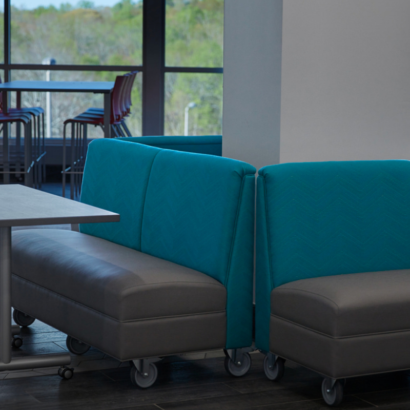 For this technical college project, we worked with an expert designer to combine both fixed and mobile furniture. A gorgeous mix of textiles were specified for a variety of Venus booths shapes. Large rounded custom Venus booths were tailored to fit perfectly around our 60"R RightEdge tabletops with Horizon FlipTop Bases--all ready to roll on the stunning Shaw Contract flooring.